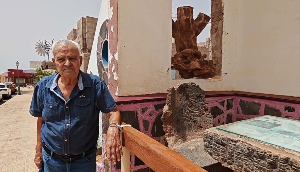 al Programa Enseñas Patrimonio junto a dos de estos grandes hornos restaurados, cerca de su casa de Puerto del Rosario, junto al mar, y también nos desplazamos hasta su otra vivienda, en Antigua, cuyos muros exteriores ha decorado con objetos tradicionales y artesanales elaborados por él mismo, lo que llama la atención de vecinos y turistas.