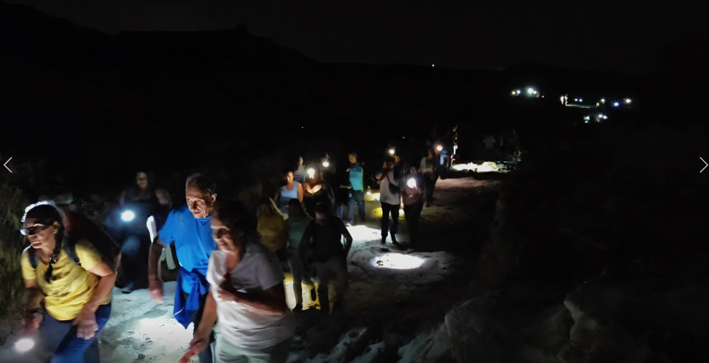 Para esta caminata, de baja dificultad y de una media hora de duración, se aprovecha el fondo arenoso de un barranco, a través de la más completa oscuridad solo rasgada por la Luna y las luces que llevan los senderistas, de todas las edades.