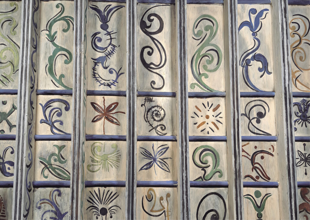 Al no existir una policromía anterior, Paz Pérez se tomó ciertas licencias a la hora de incluir motivos abstractos o caricaturescos en la decoración de los faldones, más propios de su época. Sus pinceladas no van al detalle, sabe que la obra se contemplará a cierta distancia y lo que buscaba era el efecto que le había maravillado, probablemente al ver las techumbres mudéjares de La Parroquia del Salvador, de Santa Cruz de La Palma, o las que existían en El Real Santuario de Las Nieves (fig. 6).