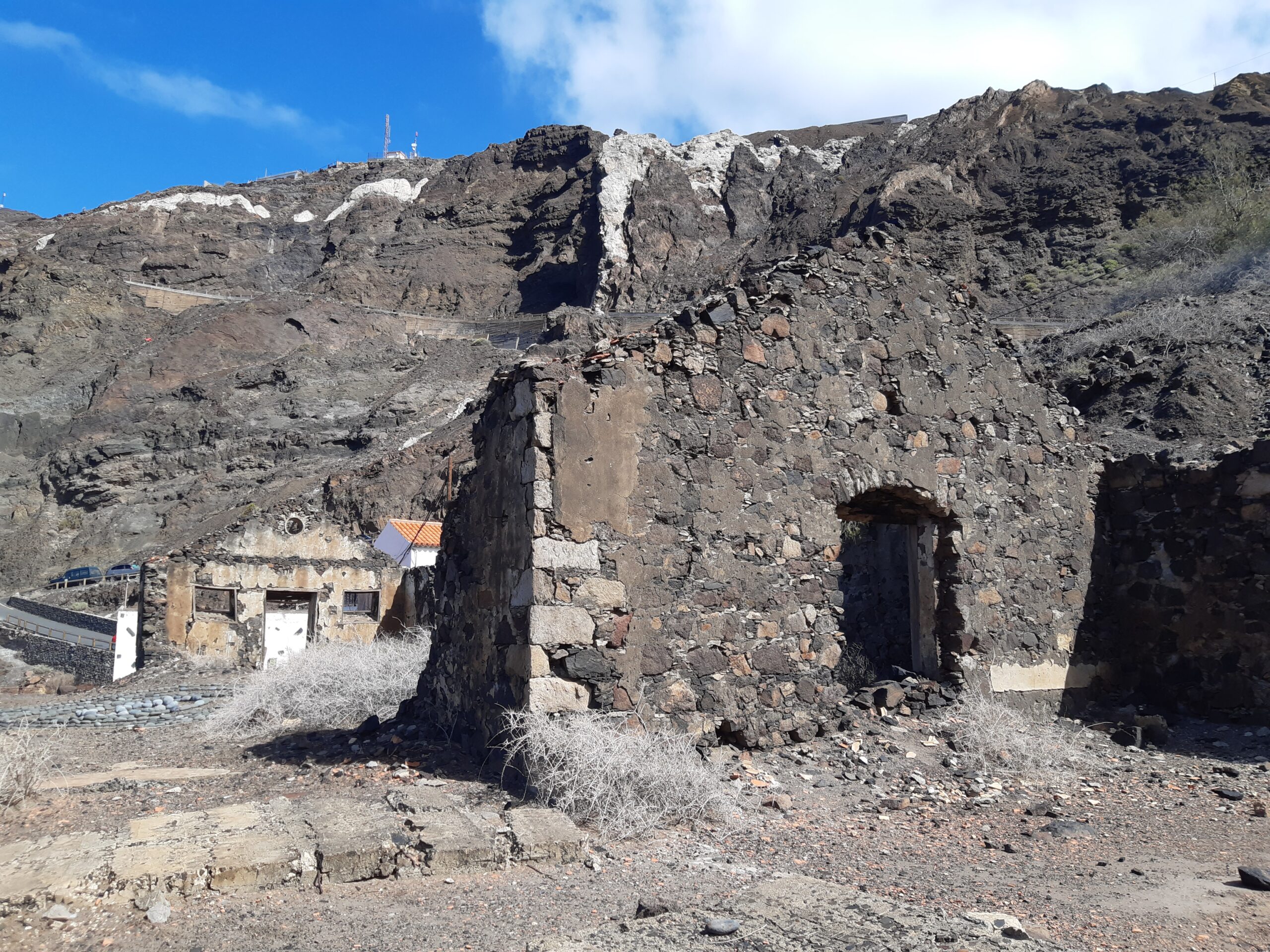 En la zona del muelle de Vueltas, Valle Gran Rey, se concentró un importante volumen de edificaciones de esta índole, aunque la mayor parte de ellas se encuentran cerradas y abandonadas. Es el caso de los almacenes de Álvaro Trujillo, uno de los mayores cosecheros exportadores de la isla. Destacar las dos naves perpendiculares, con muros en mampostería, hoy destechadas y en ruinas (Fig. 2). Así mismo, en el camino hacia Taguluche, la instalación industrial de los Mora, en mejor estado de conservación. En este caso, se trata de dos inmuebles adosados, de planta rectangular y cubierta inclinada de tejas. El de mayores dimensiones está fabricado a base de piedra y barro, sin encalar, y con 3 puertas de acceso. La menor, de piedra y barro, presenta un enlucido de los muros donde sitúa dos puertas de acceso y 3 ventanucos en la parte superior del muro lateral (Fig. 3).